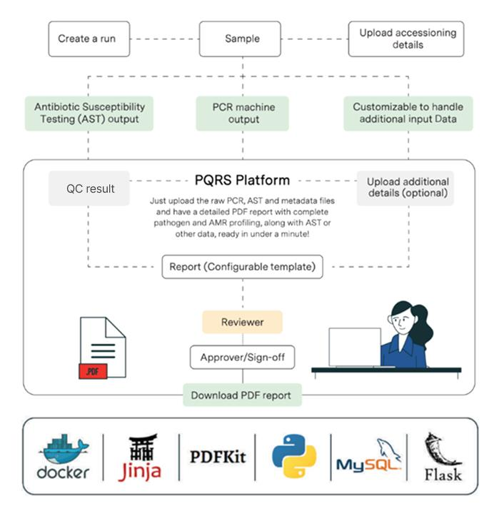 The fully automated workflow initiates with the ingestion of qPCR output files; Antibiotic Susceptibility Testing (AST) data, raw result files, metadata, or any other input types as per the customization requirements. Once the data is uploaded, QC is carried out based on the positive and negative controls available in the input file to ensure accuracy. A report is then compiled using a configurable template, quickly reviewed by a Senior Scientist and made available to the end user as a PDF. A built-in role-based access control system allows authorized users of the lab, such as reviewers and approvers, to then validate and approve the report before it’s finalized, to ensure accuracy.
